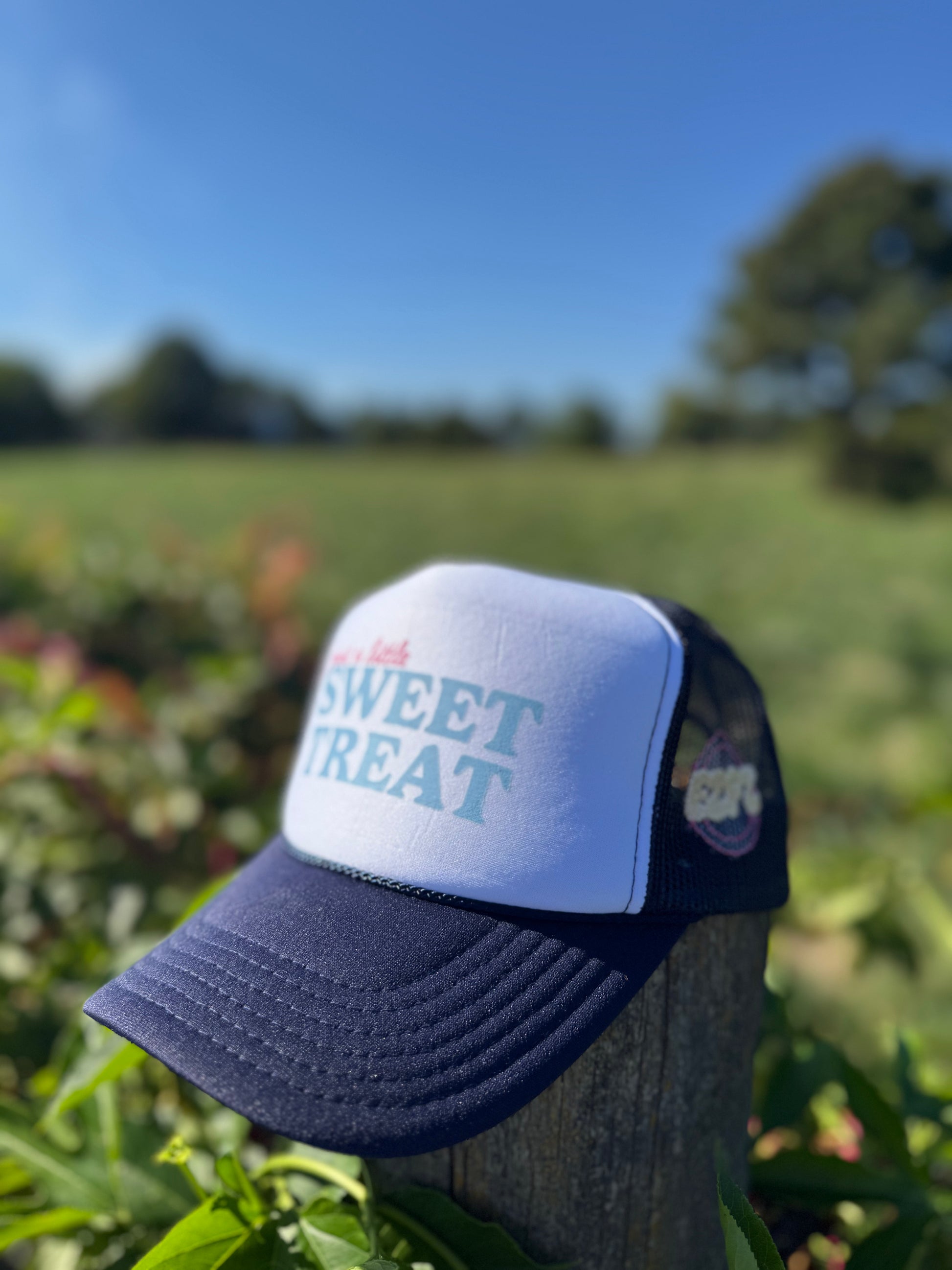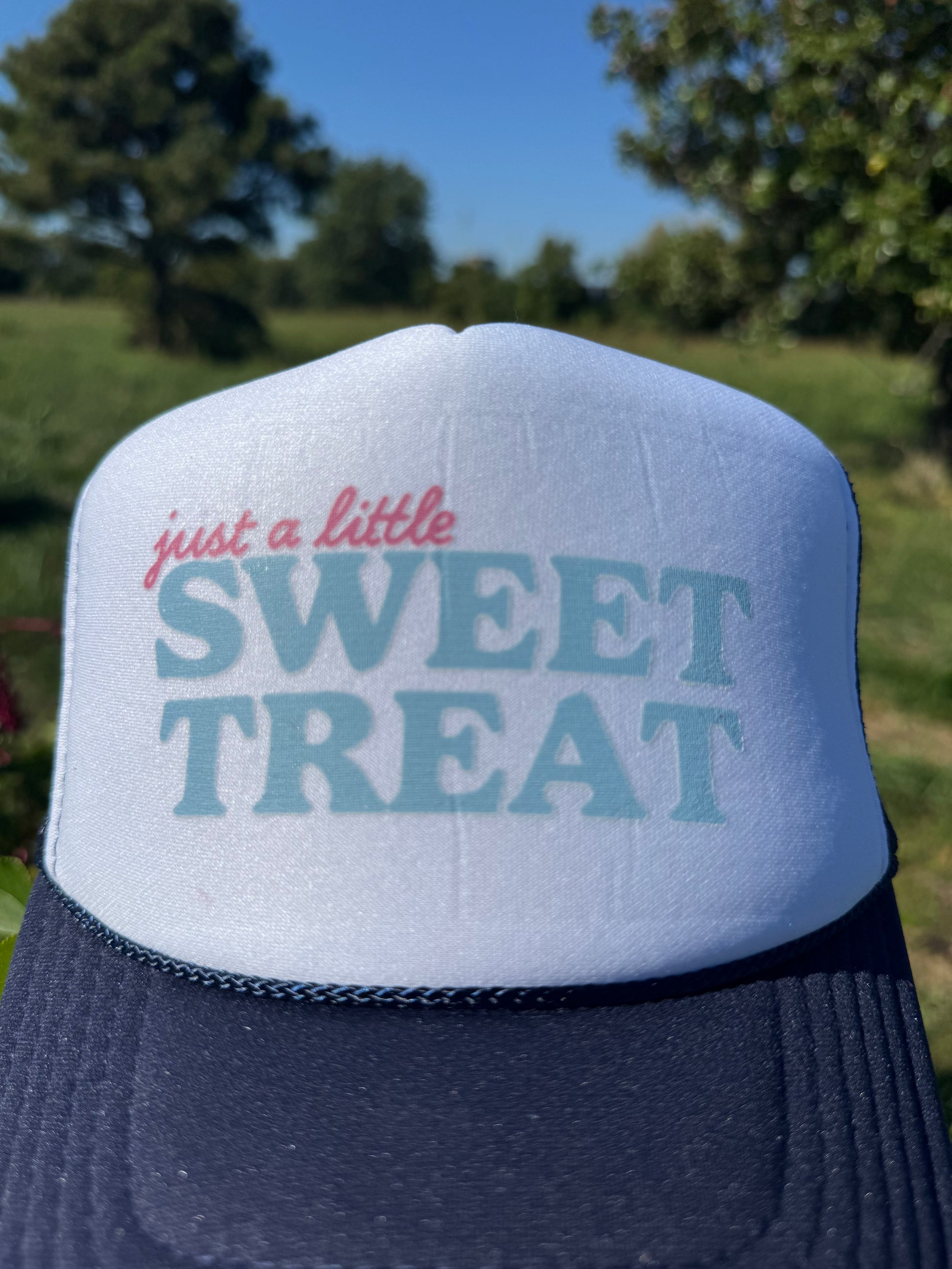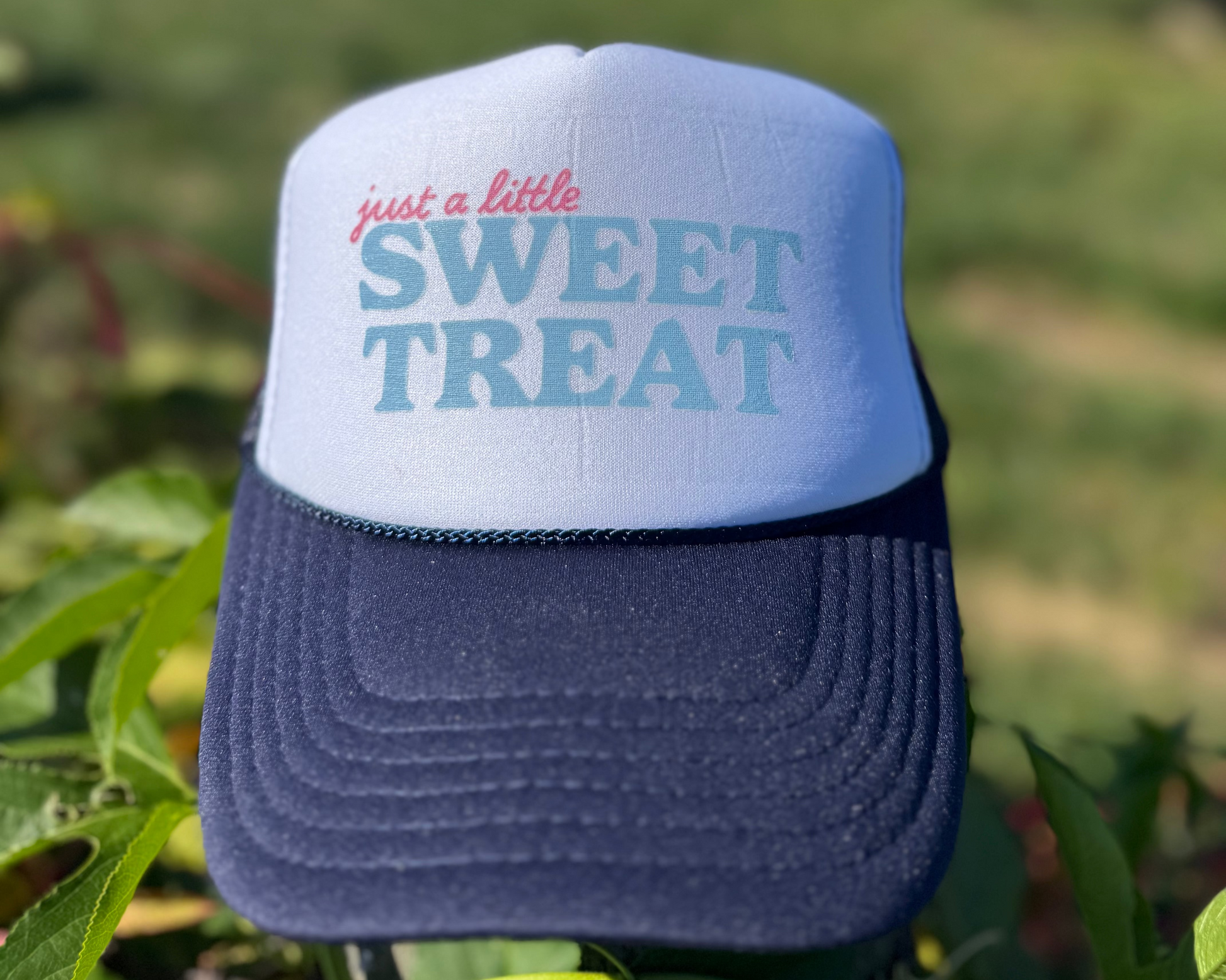 Sugar, style, and a touch of cheek. This trucker hat pairs a clean white crown with a navy bill, stitched with the playful phrase Just a Little Sweet Treat. With its breathable mesh back, snapback fit, and timeless color combo, it’s the perfect lid for keeping things light, fun, and just a little irresistible.