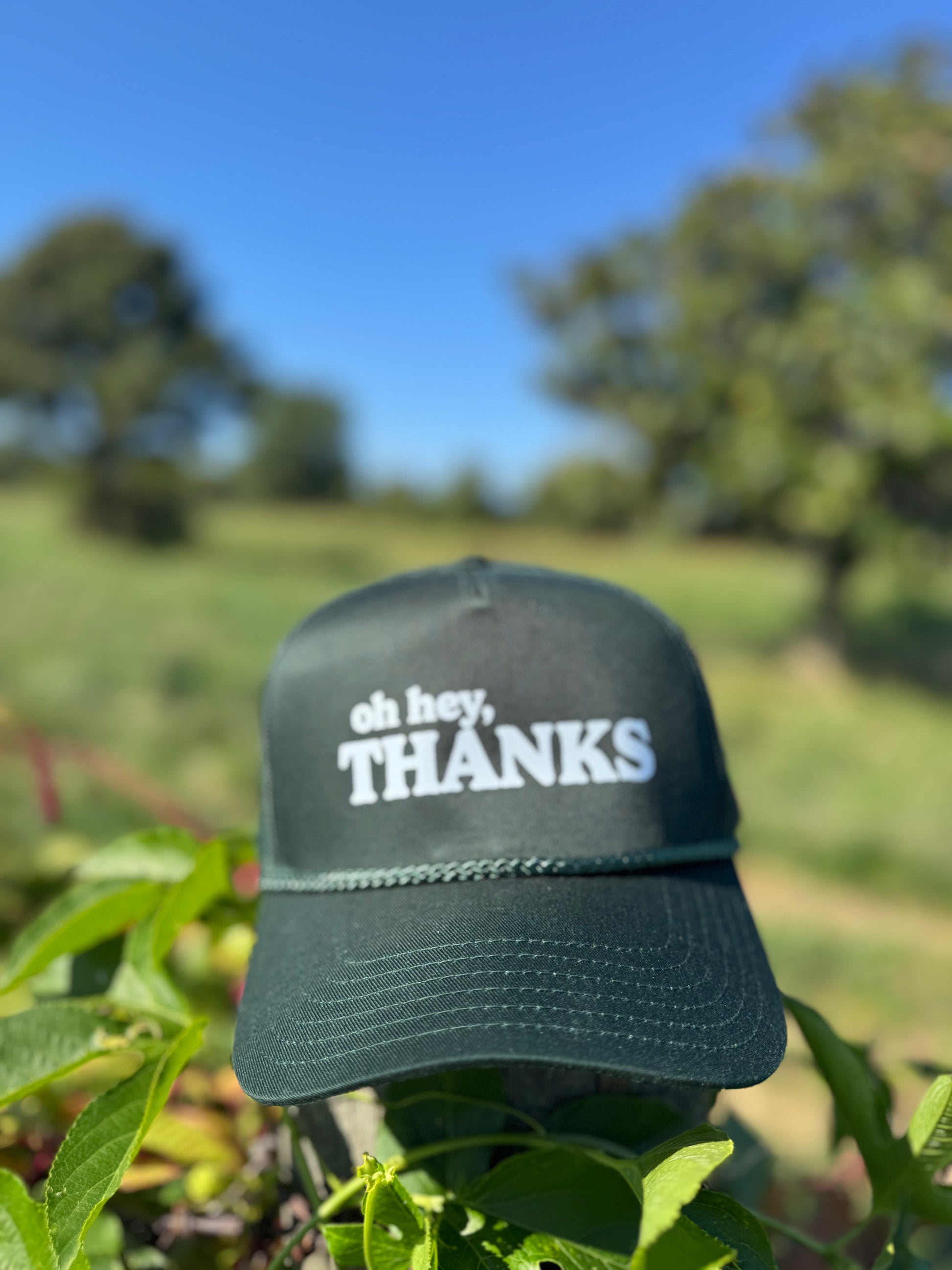 A little gratitude, stitched with attitude. This green rope trucker hat features the playful phrase Oh Hey, Thanks across the crown. With its classic rope detail, breathable mesh, and snapback fit, it’s equal parts polite and stylish—perfect for keeping it casual while tipping your cap in thanks.