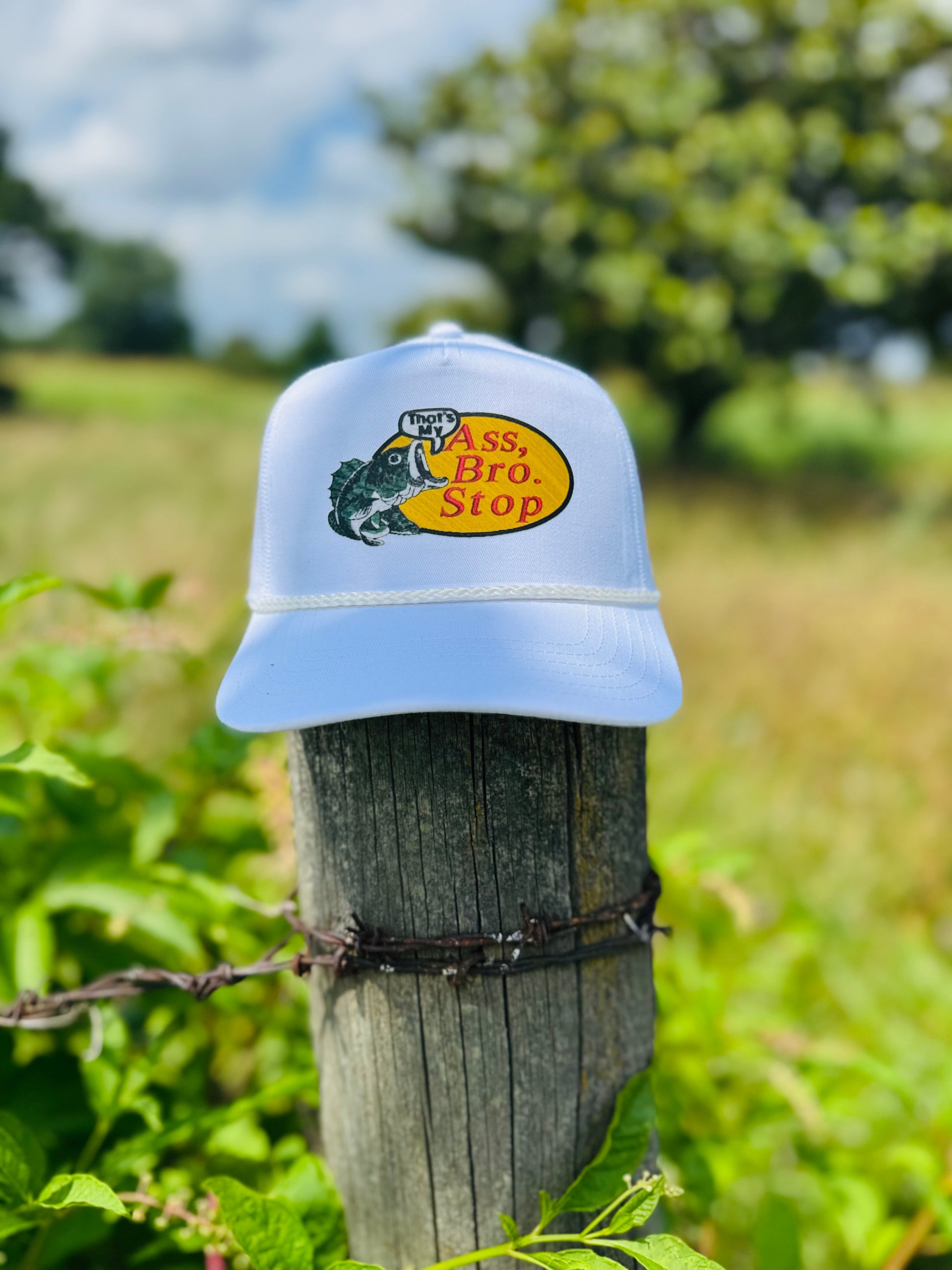 A WHITE OTTO ROPE HAT WITH BIG OUTDOORS ENERGY AND EVEN BIGGER BOUNDARY-SETTING VIBES. STYLED LIKE THE CLASSIC BASS PRO LOOK, BUT THIS ONE’S GOT A TWIST: “THAT’S MY ASS BRO, STOP” FRONT AND CENTER IN A PARODY DESIGN THAT SAYS HANDS OFF, HOMIE.